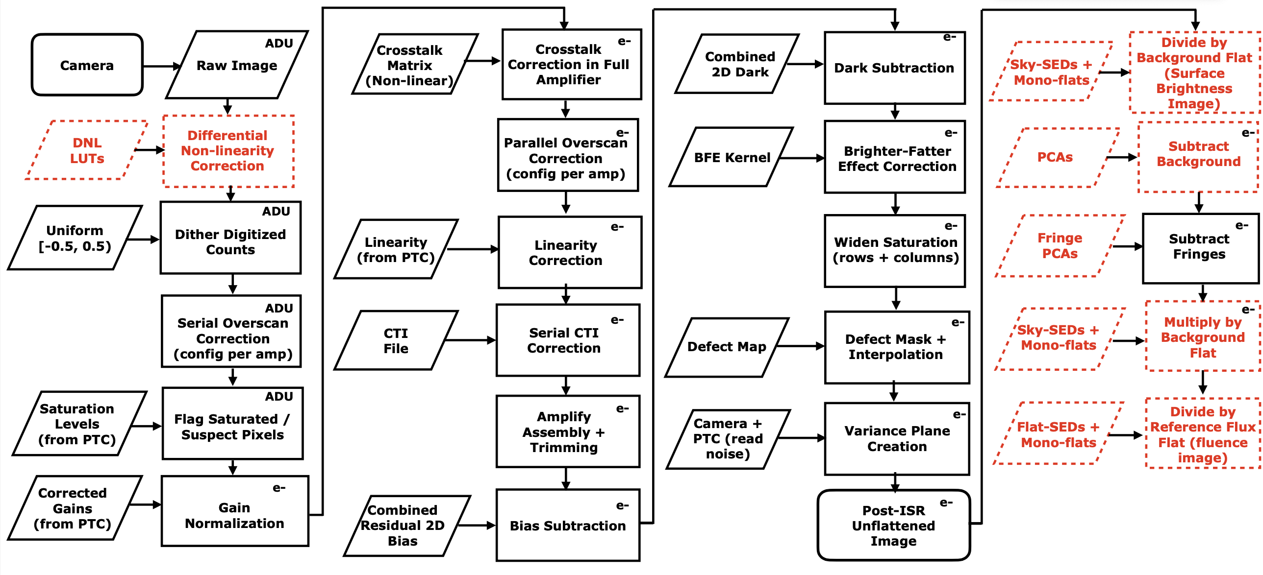 The ISR pipeline essentially “works backward” through the signal chain, correcting the integer analog-to-digital units (ADU) raw camera output back to a floating-point number of photoelectrons created in the silicon. The physical detector, shown on the left in Figure 1, is the source of effects that arise from the silicon itself, such as the dark current and the brighter-fatter effect (Broughton et al. 2024, Gruen et al. 2015).