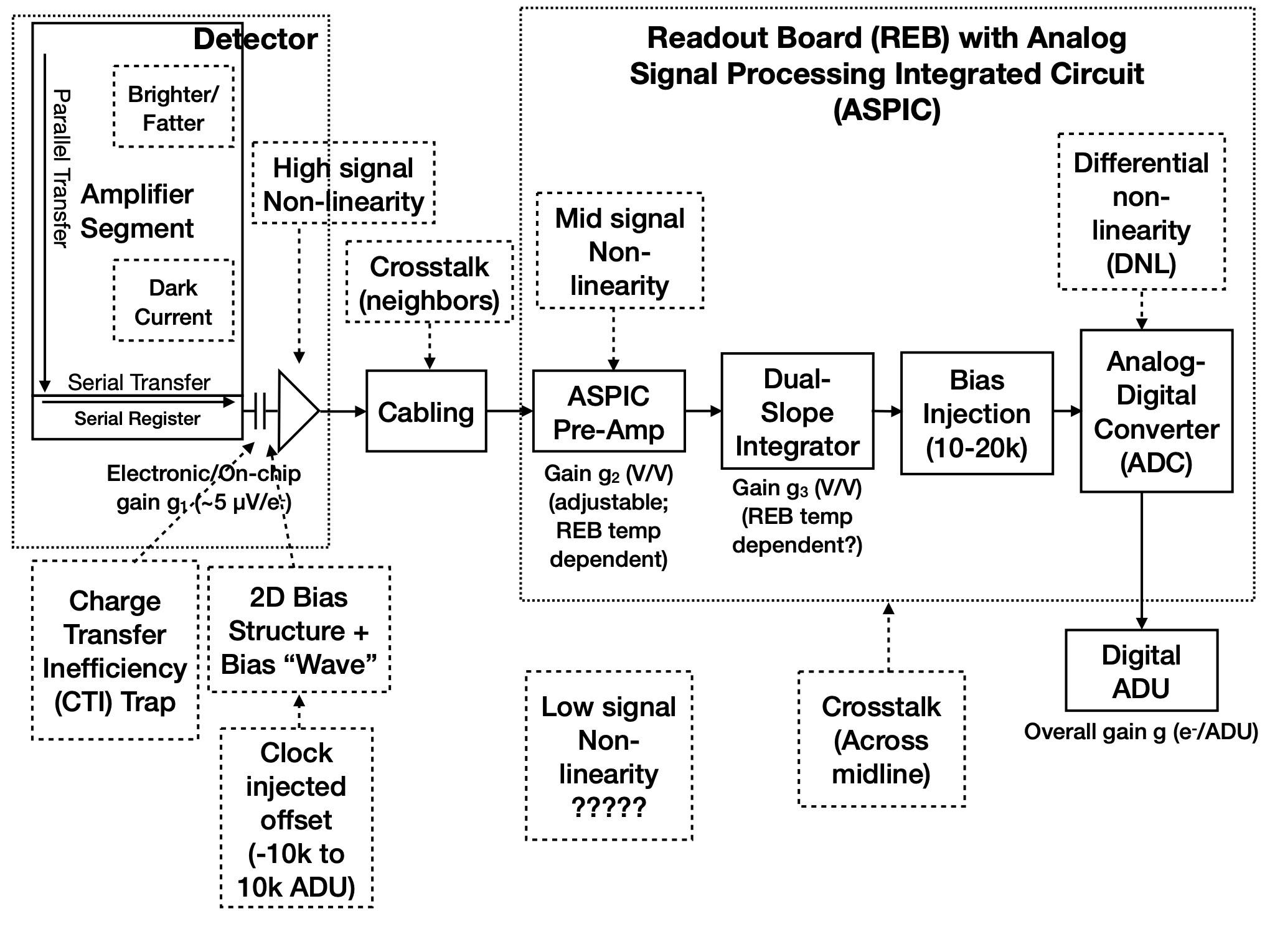 Figure 1: The model of the detector and readout electronics board (REB) components, labeled with the effects that they impart on signal (from NSF-DOE Vera C. Rubin Observatory (2025); The Vera C. Rubin Observatory Data Preview 1