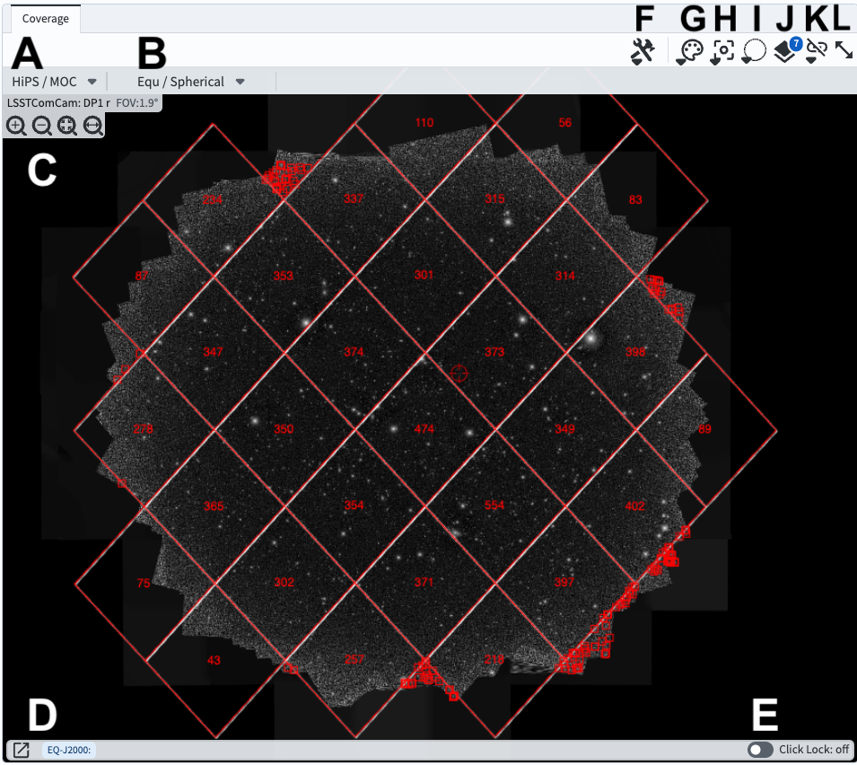 J: Overlays manipulation to change the options or color for the HEALPix and points overlay.