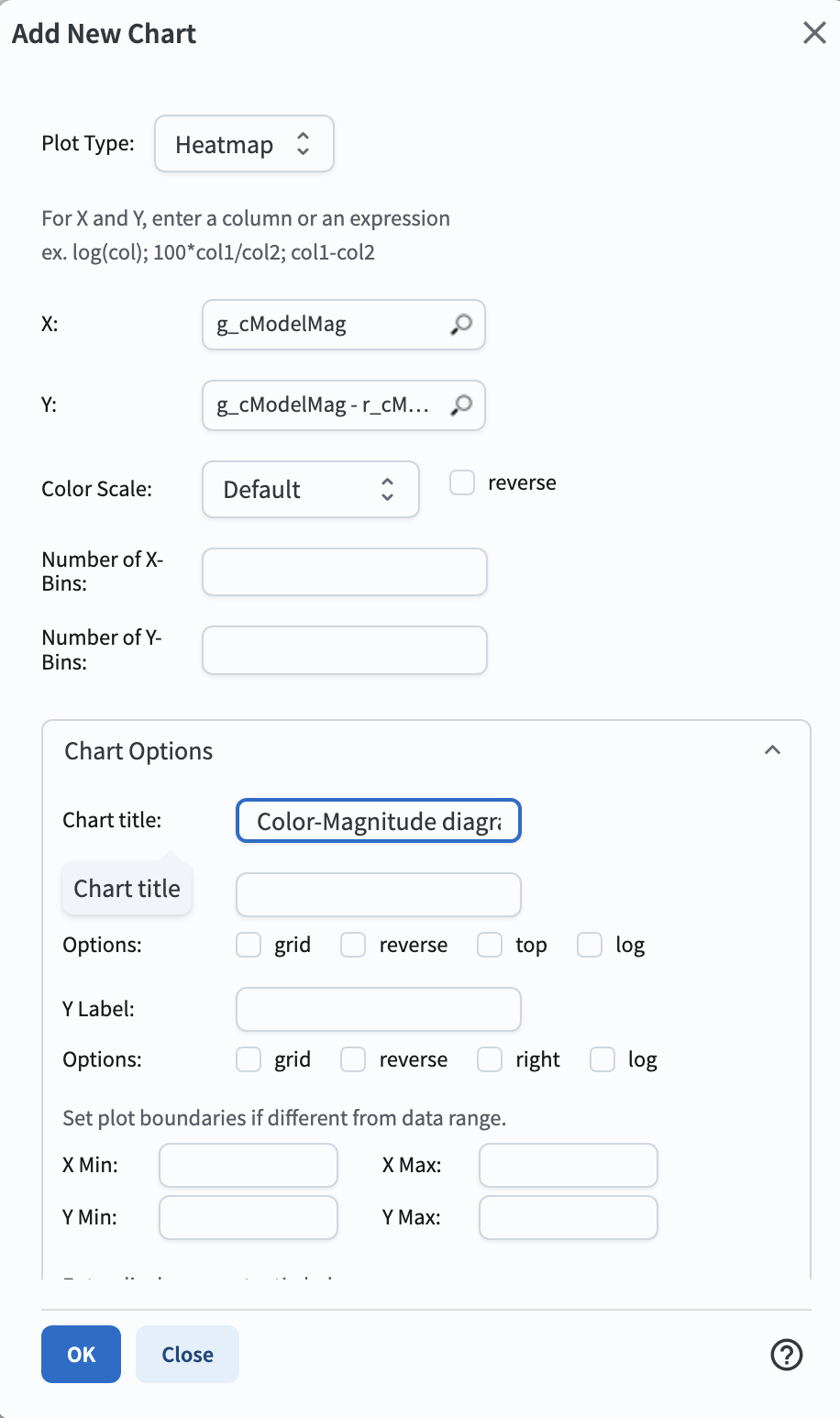 Select “Heatmap” as the plot type and enter g_cModelMag for X and the expression g_cModelMag - r_cModelMag for Y (Figure 2).