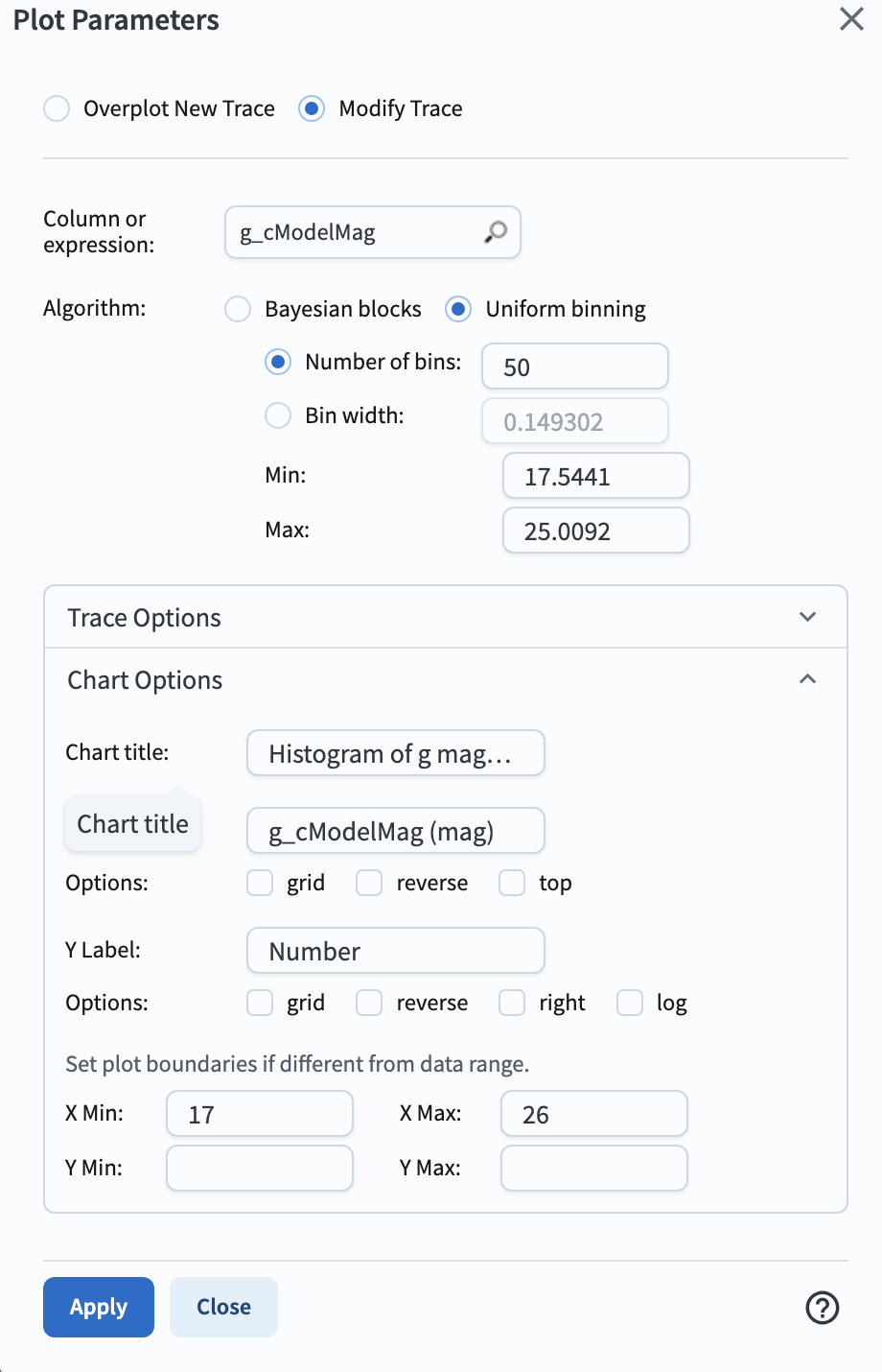 In the “Add New Chart” pop-up window select “Histogram” as the plot type and enter g_cModelMag as the column (Figure 1).