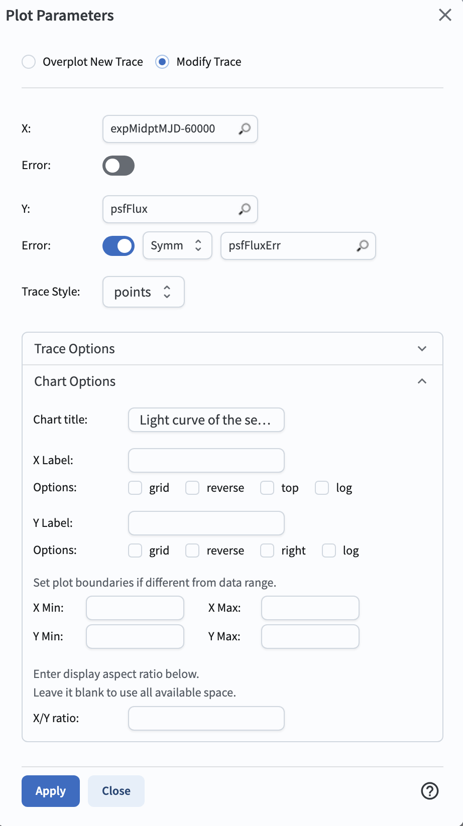 4. Change the plot to show flux vs. time. To change the plot from the default of RA vs. Dec, click on the “gear” above the plot, and enter the parameters as in the screenshot below. Click “Apply” - this will result in the light curve measured in several filters.