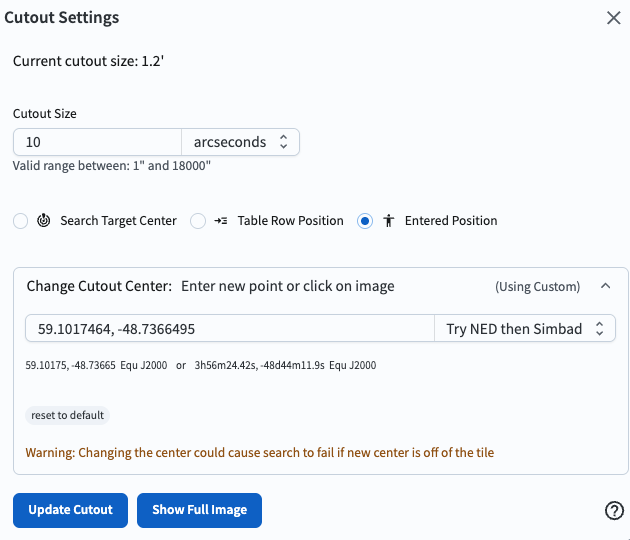 6. Create a custom cutout. Open the “Cutout Settings” window and change the size to a radius of 10 arcseconds. Click on the circle next to “Entered Position”, then click on the “Change Cutout Center” box that appears and enter “59.1017464, -48.7366495”. These are the RA and Dec coordinates of a small faint extended object, in degrees. As shown in Figure 3, click on “Update Cutout”, and the result will be as shown in Figure 4.