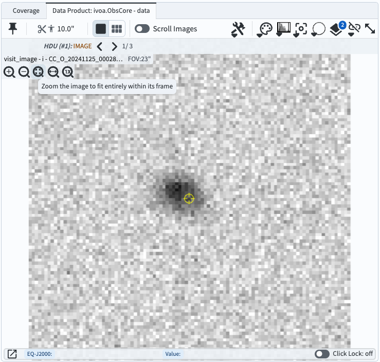 Figure 2: The default cutout, 72x72 arcseconds, centered on the original search coordinates (yellow symbol).#