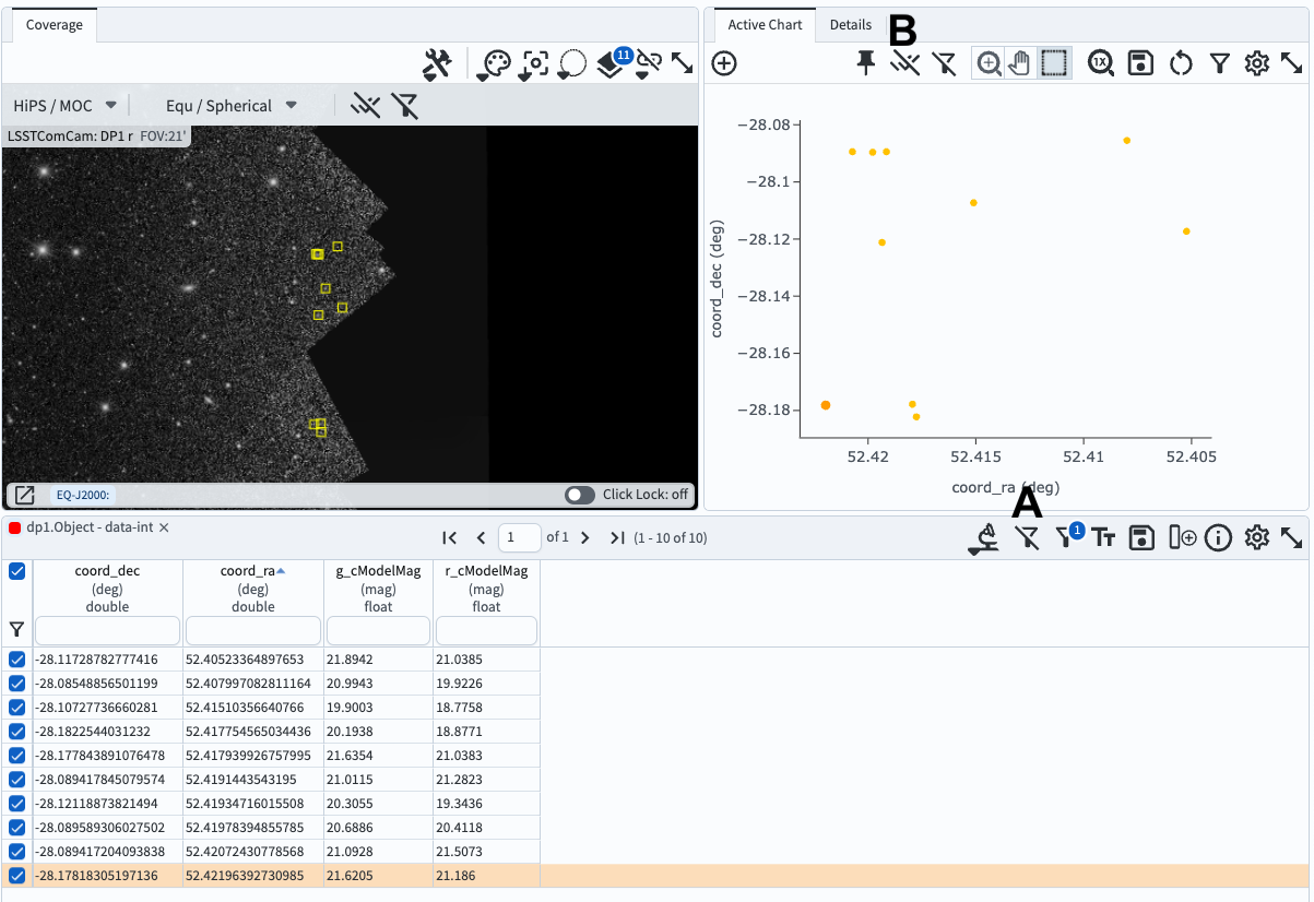 6. Select rows and use the filter. Select the first 10 rows after sorting by RA, then click the funnel (B in Figure 1). The coverage map and the active chart will also update to display only data from the selected rows, as in Figure 2.