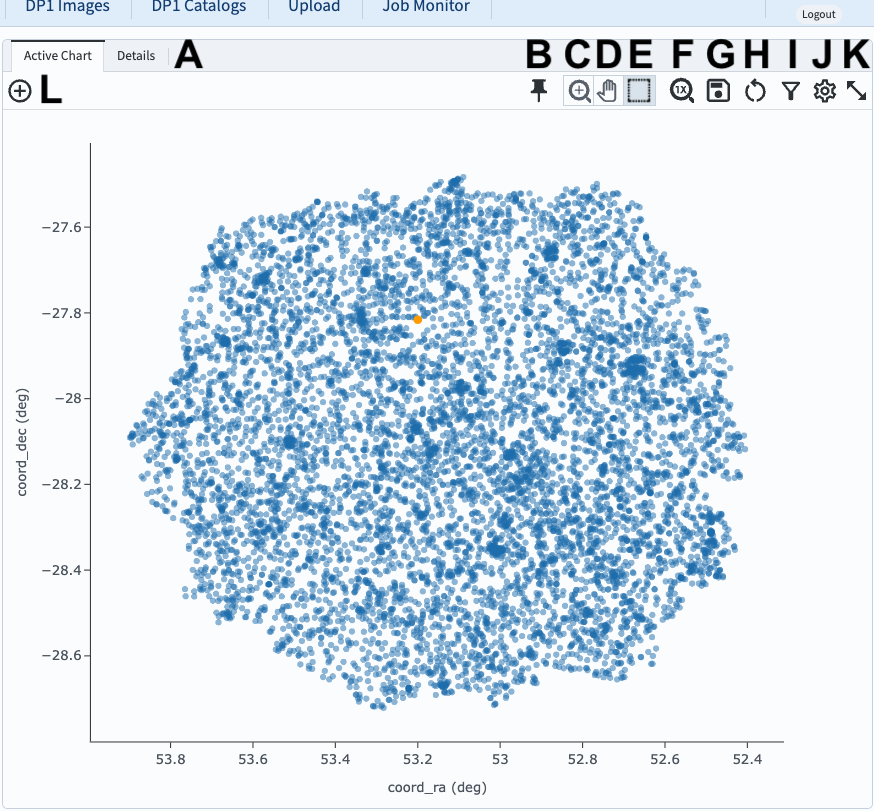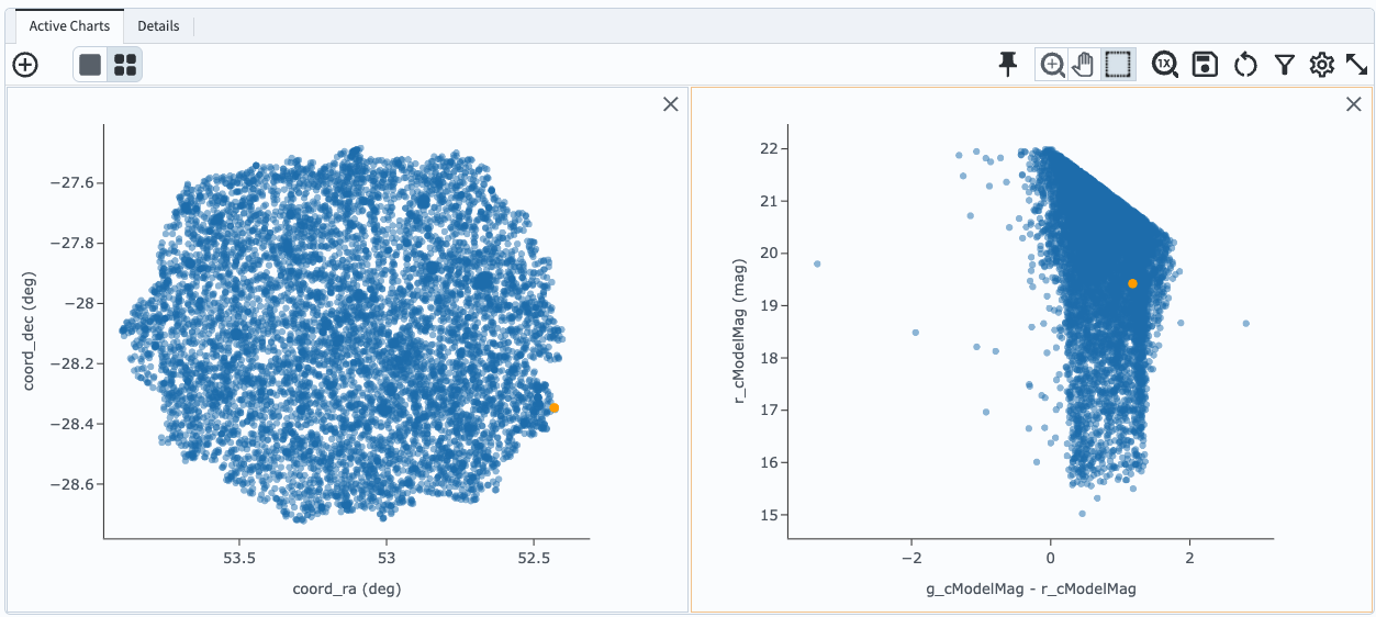 2. View the default active chart in the results interface. It should appear similar to Figure 1. If many more rows are returned, the default plot will automatically switch from scatter plot (as in Figure 1) to a 2D histogram (heatmap).