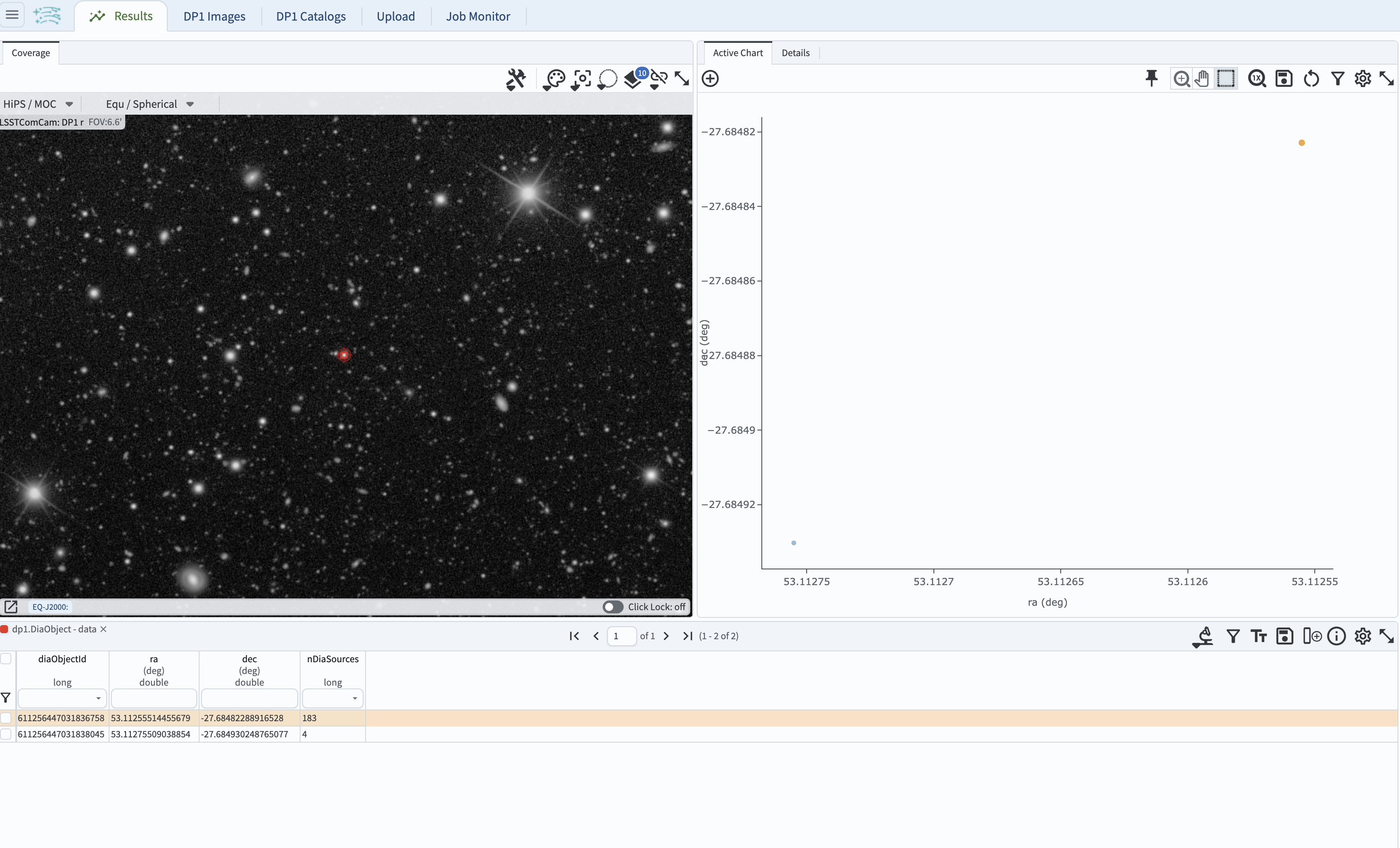 The table on the bottom displays the returned DiaObjects